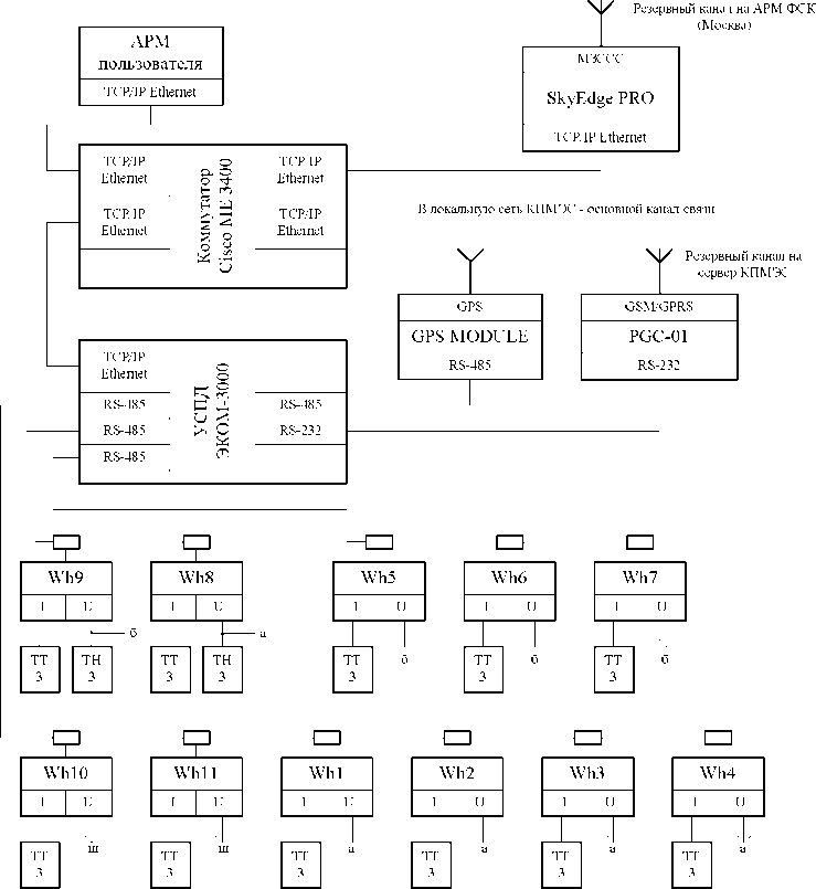Между УСПД и счетчиками ИИК используются каналы связи типа RS-485. Между компонентами ИВКЭ используются каналы связи типа TCP/IP Ethernet, которые реализованы с использованием коммутатора Cisco ME 3400. Основной канал связи УСПД с абонентами верхнего уровня реализован через локальную сеть филиала ОАО «ФСК «ЕЭС» Карельское предприятие магистральных электрических сетей (КПМЭС). Имеется два резервных канала связи: первый резервный канал связи на АРМ «ФСК «ЕЭС» (Москва) реализован через малую земную станцию спутниковой связи SkyEdge PRO; второй резервный канал связи непосредственно между УСПД и сервером КПМЭС организован с помощью модема PGS-01 через сеть сотовой связи.