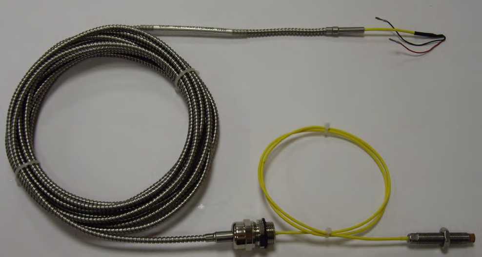 Корпус вихретокового датчика представляет собой резьбовую шпильку из нержавеющей стали, заканчивающуюся измерительной головкой; кабель датчика неразъёмно соединён с корпусом.