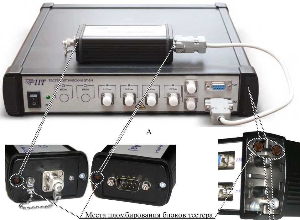Рисунок 1 - Общий вид тестера, места пломбирования и маркировки