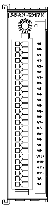 Модуль APAX-5017H представляет собой модуль аналогового ввода с 12 дифференциальными входами и возможностью программной установки входных диапазонов. Потребляемая мощность от внешнего источника 24 В не более 3,5 Вт.