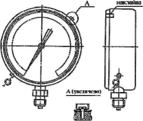 На стыке корпуса и крышки манометра наклеивается наклейка либо на стекло манометра или на мастику, нанесенную на шляпку соединительного винта с пломбировочной чашкой на корпусе манометра, или на пломбу, установленную на контровочной проволоке, пропущенной через отверстие стопорного винта крышки и специального отверстия на выступе крышки, наносят оттиск поверительного клейма.