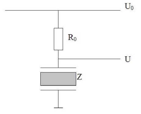 U0 - опорное напряжение, U - падение напряжения на пьезоэлементе, R0 - резистор, Z -комплексный импеданс пьезоэлемента или преобразователя.