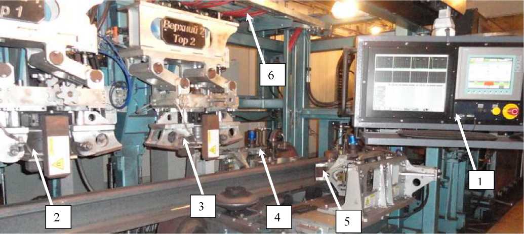На рисунке 1 цифрами обозначены: 1 - пульт управления; 2 - ЭМАП «Тор 1»; 3 - ЭМАП «Тор 2»; 4 - ЭМАП «Side 1»; 5 - ЭМАП «Side 2»; 6 - компьютер микросистемы СО-НОТРОН™-ЕМАТ 880.