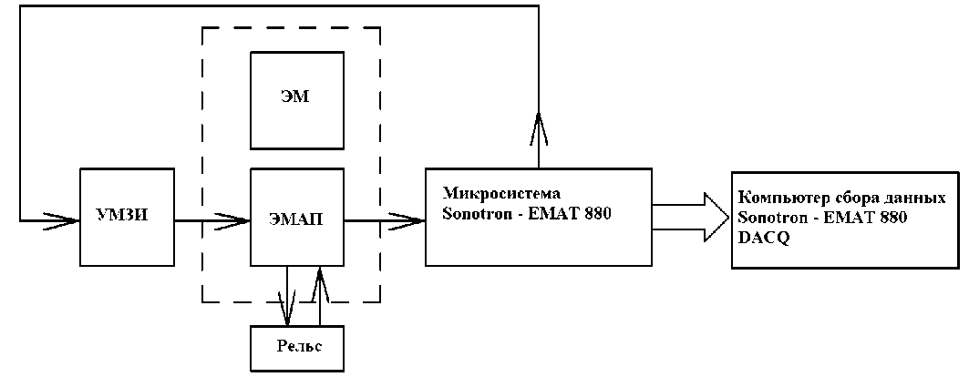 По каждому синхроимпульсу компьютера микросистемы СОНОТРОН™-ЕМАТ 880 (Sonotron 880 MS) во всех четырех каналах одновременно с заданной вручную частотой заполнения и длительностью формируются радиоимпульсы, которые усиливаются в усилителе мощности зондирующих импульсов (УМЗИ). С выхода УМЗИ радиоимпульс поступает на соответствующий ЭМАП, расположенный под полюсом электромагнита (ЭМ). ЭМ создает магнитное поле, ориентированное по нормали к поверхности контролируемого изделия. Витки рабочей части ЭМАП параллельны поверхности изделия, поэтому к результате взаимодействия постоянного магнитного поля с полем вихревых токов в изделии возникают т.н. поперечные ультразвуковые колебания. Эти колебания распространяются в направлении противоположной поверхности рельса. Принятый ЭМАП сигнал подается на соответствующий вход микросистемы СОНОТРОН™-ЕМАТ 880, усиливается с заданным коэффициентом усиления, оцифровывается и отображается на экране компьютера микросистемы СОНОТРОН™-ЕМАТ 880 в виде Аскана. Анализ амплитуды донных сигналов выполняется в зонах стробирующих импульсов. Для УЗК шейки рельса стробирующие импульсы располагают в зоне второго донного сигнала, для УЗК головки - как в зоне первого, так и в зоне второго донного сигнала. Далее оцифрованный сигнал передается в компьютер сбора данных СОНОТРОН™-ЕМАТ 880 DACQ (Sonotron 880 DACQ), который сохраняет и отображает информацию по амплитуде донных сигналов в зонах, указанных выше стробирующих импульсов, в виде В-сканов по всей длине контролируемого рельса.