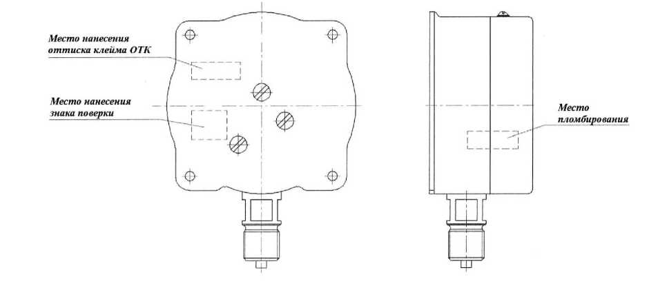 Схема пломбировки от несанкционированного доступа, обозначение мест нанесения знака поверки и оттисков клейма ОТК представлены на рисунке 2.