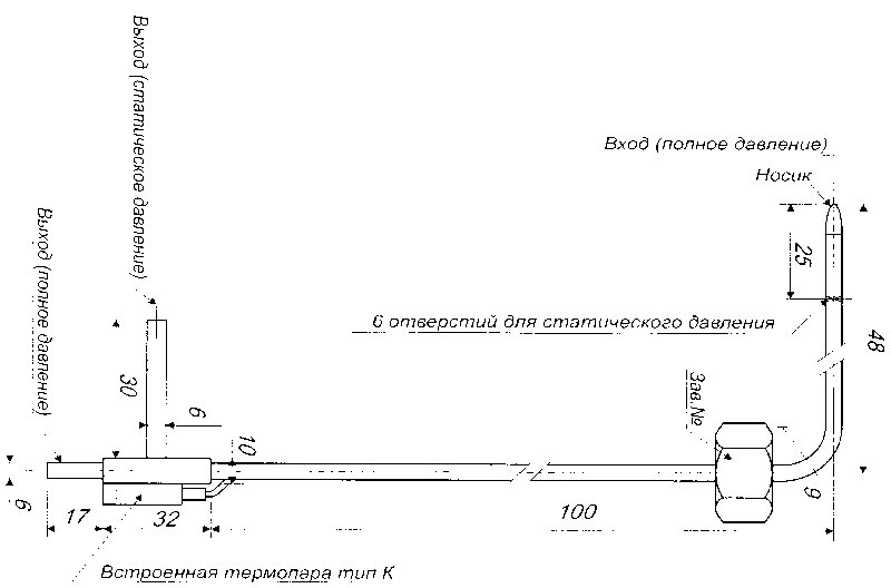 Трубки Пито-Прандтля изготовлены из нержавеющей стали, и имеют Г-образную форму, на носике имеется торцевое отверстие для приема полного давления измеряемой среды, отверстия для статического давления расположены на расстоянии 25 мм от носика. Чувствительный элемент термоэлектрического преобразователя расположен внутри трубки Пито-Прандтля.