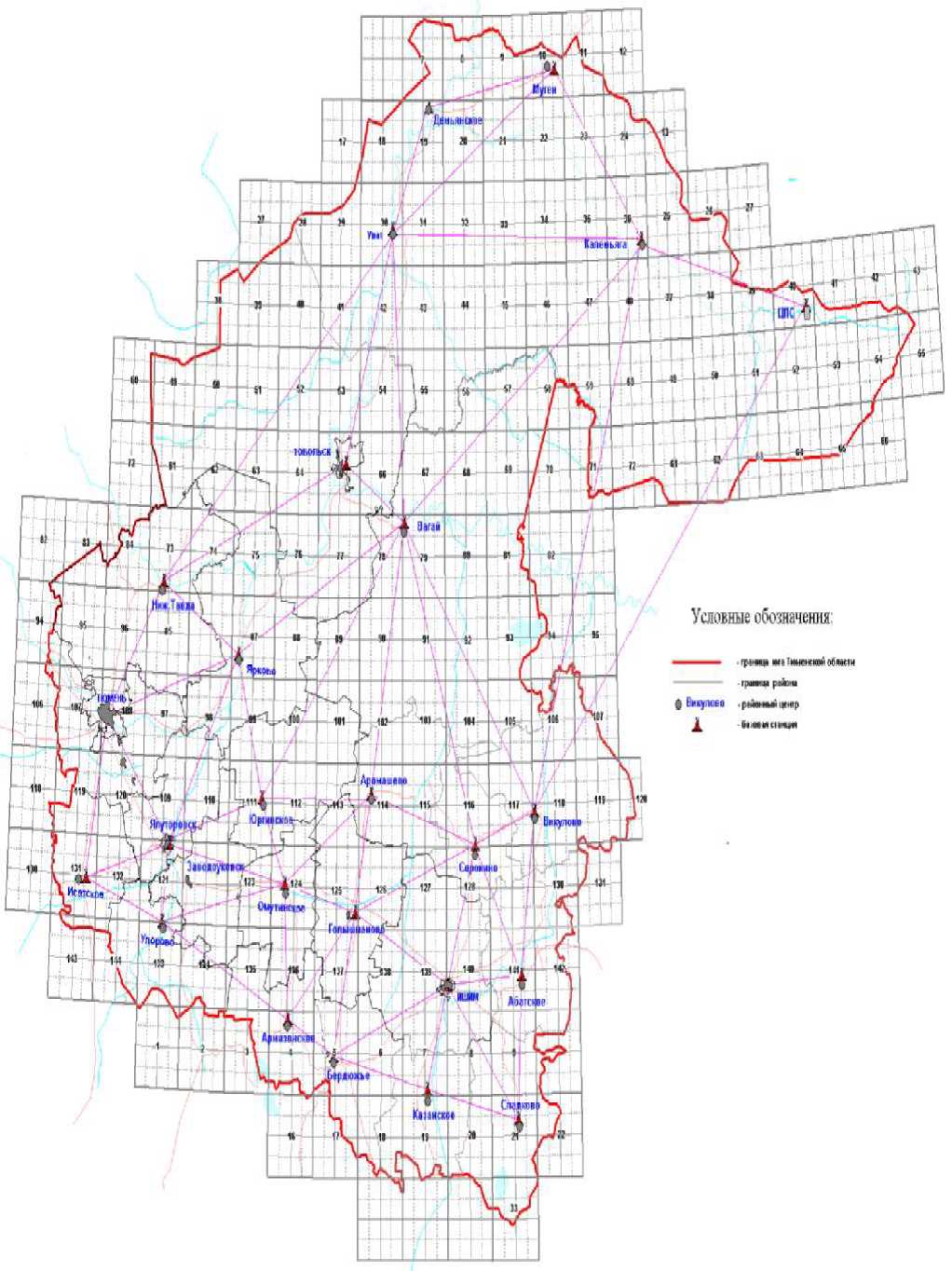 - двадцать пять опорных базисных пунктов на территории Тюменской области, расположенных в населенных пунктах Абатское, Армизонское, Бердюжье, Голышманово, Демьян-ское, Исетское, Казанское, Калемьяга, Муген, Нижняя Тавда, Сладково, Сорокино, Упорово, Юр-гинское, ЦПС; Аромашево, Вагай, Викулово, Ишим, Омутинское, Тюмень, Тобольск, Уват, Ялуторовск Ярково.