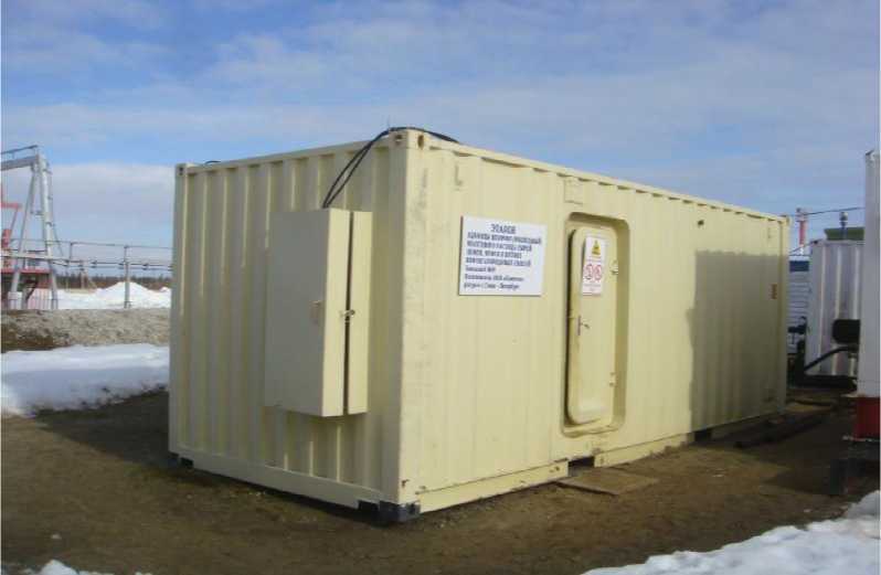 Контейнер конструктивно разделен газонепроницаемой, теплоизолированной перегородкой на два отсека: №1 - технологический отсек, в котором располагаются измерительные емкости, манометр МП2-У-0-60 кгс/см2 (номер по Госреестру № 10135-05), датчик давления Метран-100-ДИ-Ех (номер по Госреестру № 22235-08), термопреобразователь с унифицированным выходным сигналом Метран-274-Ех (номер по Госреестру № 21968-06), трубопроводная обвязка, запорная арматура, источники и детекторы гамма-излучения, обогреватели и остальное технологическое оборудование; №2 - аппаратурный отсек, в котором располагаются рабочее место оператора с персональным компьютером, шкаф силовой, шкаф контроля и управления.