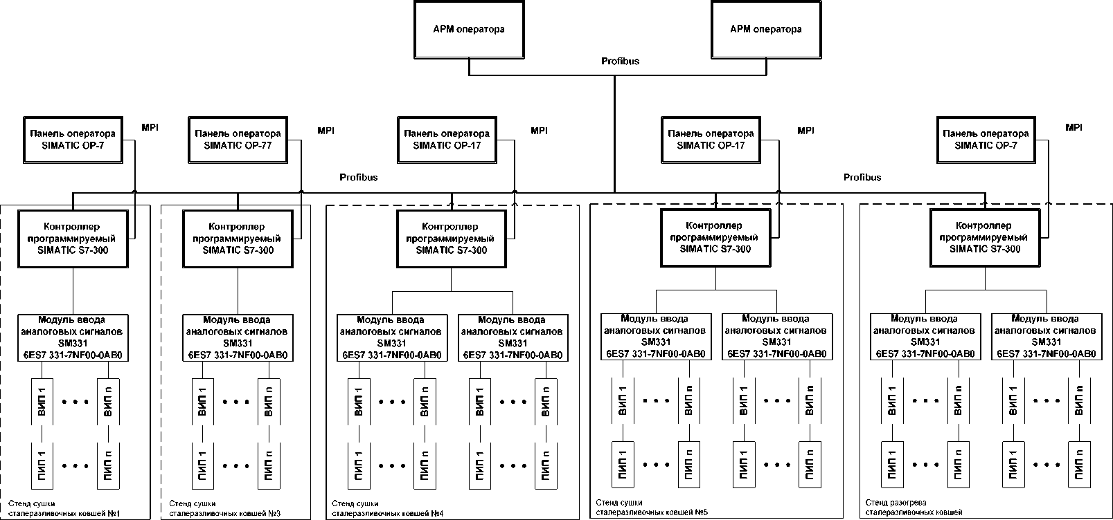 5.2 Информационный обмен между ПЛК и АРМ оператора осуществляется по интерфейсу Profibus DP, между ПЛК и панелями оператора - по интерфейсу MPI.