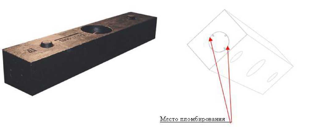 Гиря имеет форму параллелепипеда и изготовлена из серого чугуна. Общий вид гири представлен на рис.1. Гиря имеет две подгоночные полости, заполненные технической дробью из чугуна по ГОСТ 11964, и закрытые крышками с помощью винтов, два из которых фиксируются пломбой. Схема пломбирования гири представлена на рис. 2.