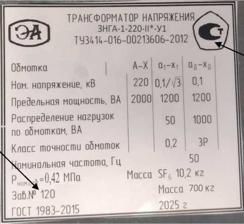 «Трансформатор напряжения ЗНГА-1-220-И*-У1, ТУ 3414-016-00213606-2012», трансформатор напряжения ЗНГА, конструктивное исполнение 1, класс напряжения первичной обмотки 220 кВ, степень загрязнения изоляции II*, климатическое исполнение У1».