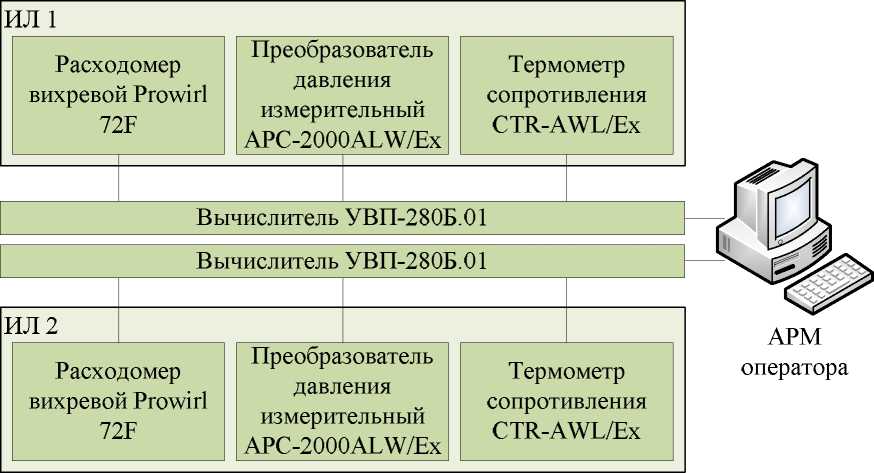 СИКГ имеет две измерительных линии (ИЛ), состоящих из измерительных трубопроводов с размещенными на них средствами измерений объемного расхода и объема, температуры и давления. Результаты измерений поступают в вычислитель и далее на автоматизированное рабочее место (АРМ) оператора.