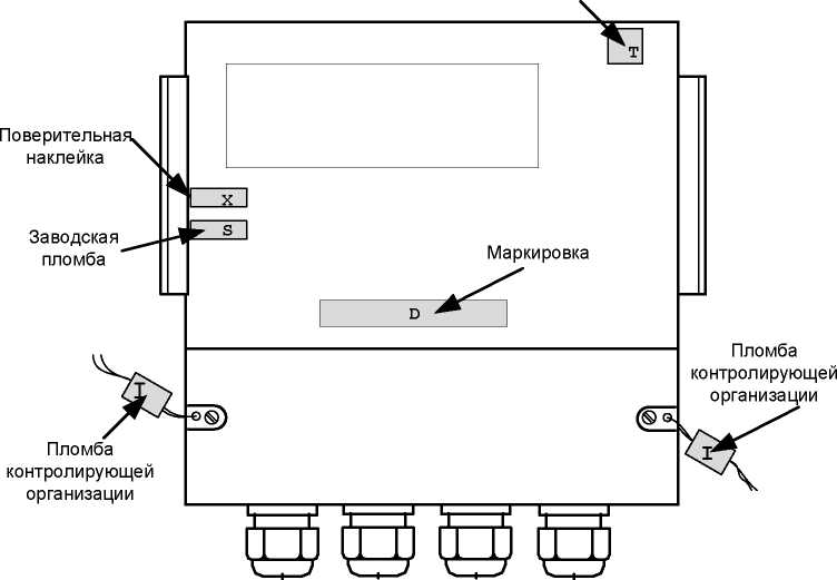 На схеме 1 указаны места пломбировки от несанкционированного доступа и место размещения наклеек, в том числе о поверке.