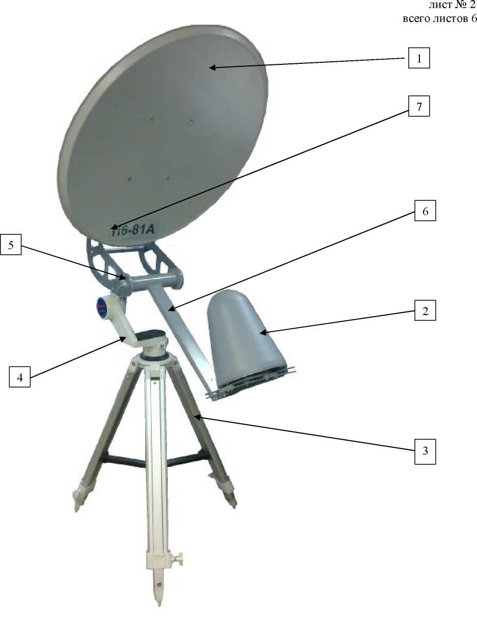 Антенна состоит из металлического рефлектора (зеркала) в виде неосесимметричного фрагмента параболоида вращения; облучателей сменных; поворотно-крепежного устройства, позволяющего устанавливать антенну на треногу и ориентировать её в заданном направлении.