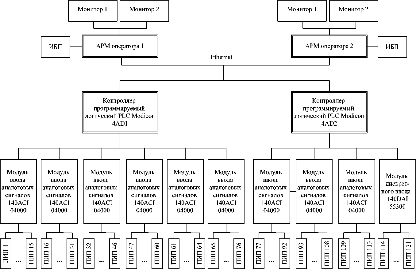Принцип действия ИС заключается в следующем. ИС функционирует в автоматическом режиме. Первичные измерительные преобразователи выполняют измерение физических величин и их преобразование в унифицированный сигнал постоянного тока (от 4 до 20 мА). Контроллеры программируемые логические PLC Modicon (ПЛК) измеряют унифицированные выходные сигналы измерительных преобразователей, выполняют их аналого-цифровое преобразование, осуществляют преобразование цифровых кодов в значения параметров технологического процесса, выполняют вычислительные и логические операции, формируют сигналы аварийной сигнализации и передают данные на АРМ оператора. АРМ оператора обеспечивают визуализацию и хранение значений параметров технологического процесса, отображение информации о ходе технологического процесса, а также настройку сигнализации.