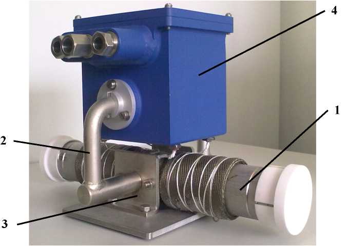 На рисунке 1 показан ПП с диаметром условного прохода (Ду) 40 мм. ПП имеет трубу 1, выполненную из стали марки 09Х18Н9, к трубе прикреплен индуктор, создающий магнитное поле в канале трубы. Индуктор состоит из магнитопровода 2 с полюсными наконечниками 3 и индукционной катушки, расположенной внутри корпуса 4. Внутри корпуса имеется также клеммная колодка, к которой подведены проводники от индукционной катушки и двух электродов, приваренных к наружной поверхности трубы.