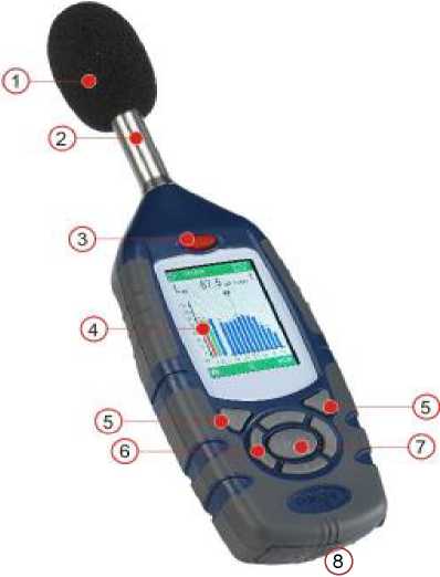 1 - Противоветровая защита, 2 - Встроенный предусилитель, 3 - Кнопка ВКЛ./ВЫКЛ., 4 -Дисплей, 5 - Программные кнопки, 6 - Кнопки курсора навигации, 7 - Кнопка Запуск/Остановка (Run/Stop), 8 - Разъемы для подключения внешних устройств