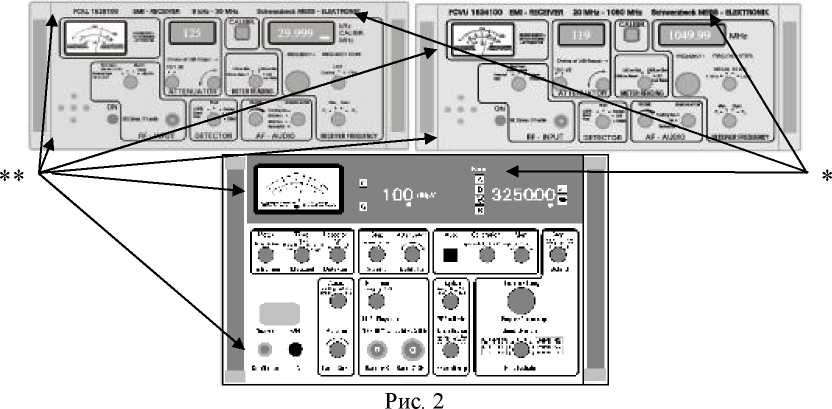 приемник измерительный ESU8 (рег. № 41971-09), диапазон частот от 20 Гц до 8 ГГц, пределы допускаемой абсолютной погрешности измерений отношения уровней ± 0,4 дБ;