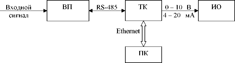 Входной сигнал с первичного преобразователя, установленного на испытуемом объекте (сигнал термо-ЭДС), подается на вход вторичного преобразователя (ВП) (рисунок 1), преобразуется в цифровую форму и передается по каналу связи RS-485 в технологический контроллер (ТК). ТК, по соответствующей программе, пересчитывает полученные данные в значение температуры и передает их по каналу Ethernet в персональный компьютер (ПК), который отображает значения температуры объекта на мониторе.
