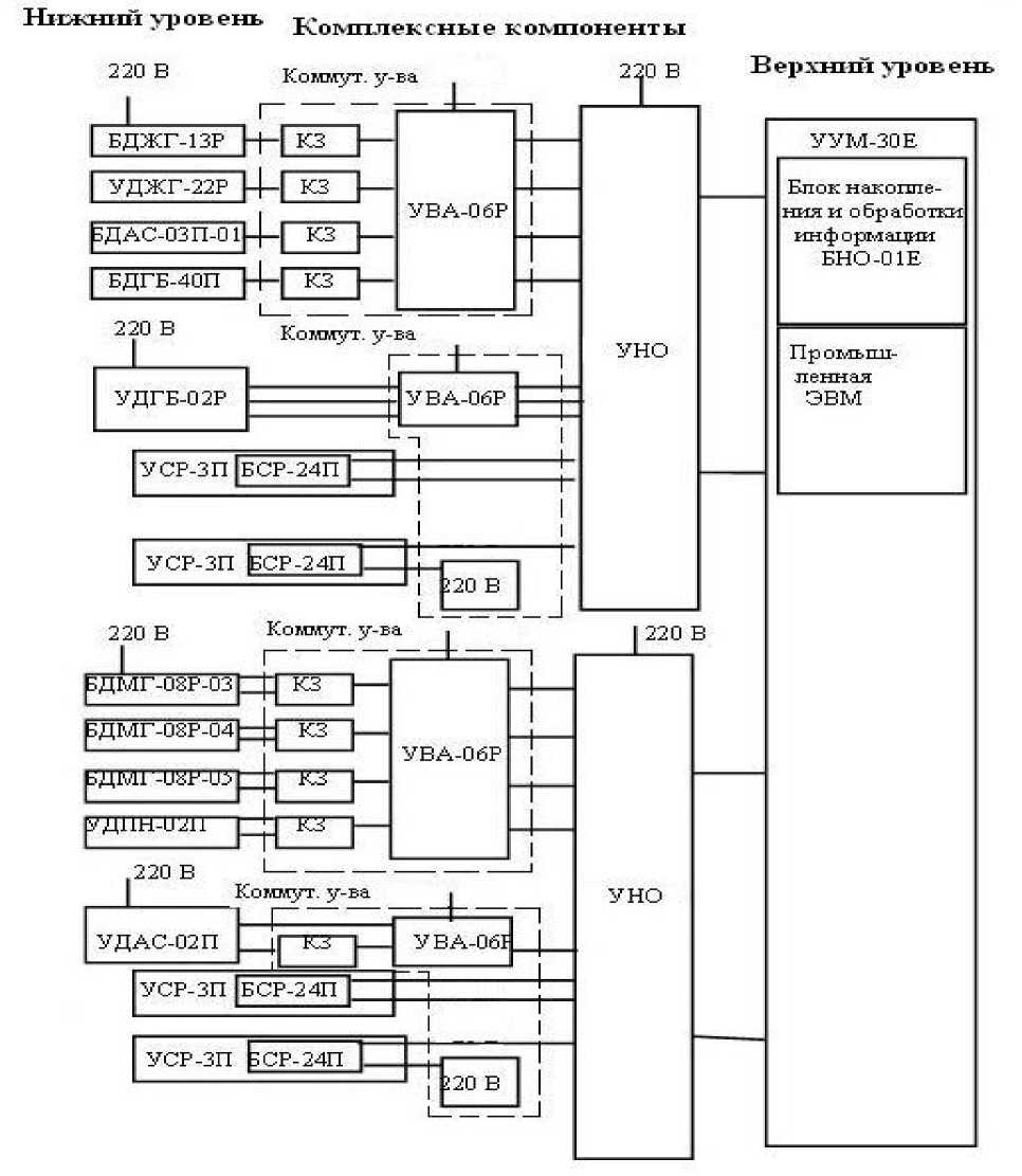 Устройства коммутации включают в себя клеммные коробки (КЗ), соединительные кабели и устройства УВА-06Р, обеспечивающие питание блоков и устройств детектирования и передачу измерительного сигнала от них к устройствам накопления и обработки информации УНО. Преобразований измерительной информации в устройствах коммутации не происходит.