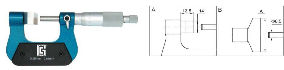 - МКД3 - с малыми измерительными поверхностями для измерений канавок и шлицов (рисунок 2, а)). Микрометры имеют два вида исполнений измерительных наконечников (рисунок 2, б));