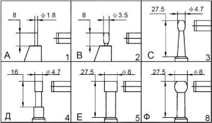 - МКД5 - с точечными измерительными поверхностями для измерений труднодоступных размеров (рисунок 4, а). Микрометры имеют четыре вида исполнений измерительных наконечников (рисунок 4, б));