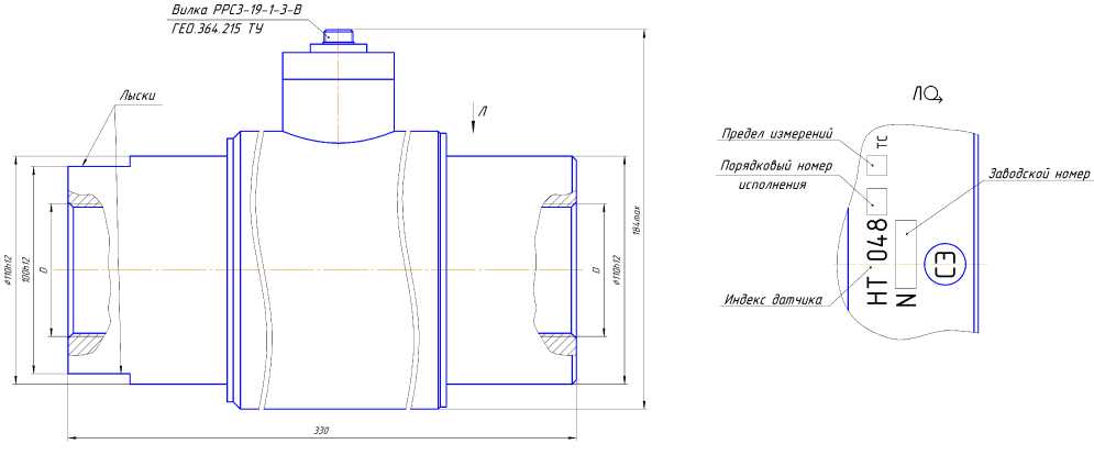 Общий вид датчика НТ 048 с указанием мест нанесения заводского номера, маркировки приведен на рисунке 1, габаритные и установочные размеры - на рисунке 2. Маркировка датчика и заводской номер в формате № (числовой) наносится на корпус датчика методом лазерной гравировки.