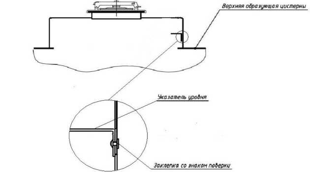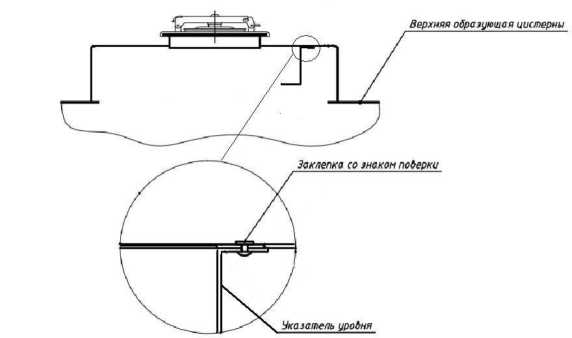 Рисунок 4 - Схема пломбировки от несанкционированного изменения положения указателя уровня налива, обозначение места нанесения знака поверки на заклепку, проходящую через верхнюю стенку горловины и указатель уровня налива в виде металлического уголка