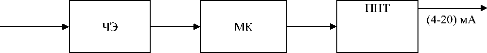 Измеряемое давление воспринимается чувствительным элементом (ЧЭ) и преобразуется в пропорциональные электрические сигналы. Сигналы с выхода ЧЭ поступают в микроконтроллер (МК), где происходит вычисление и формирование выходного сигнала. Преобразователь напряжение-ток (ПНТ) преобразует сигнал с микроконтроллера (МК) до стандартного значения (4-20) мА.