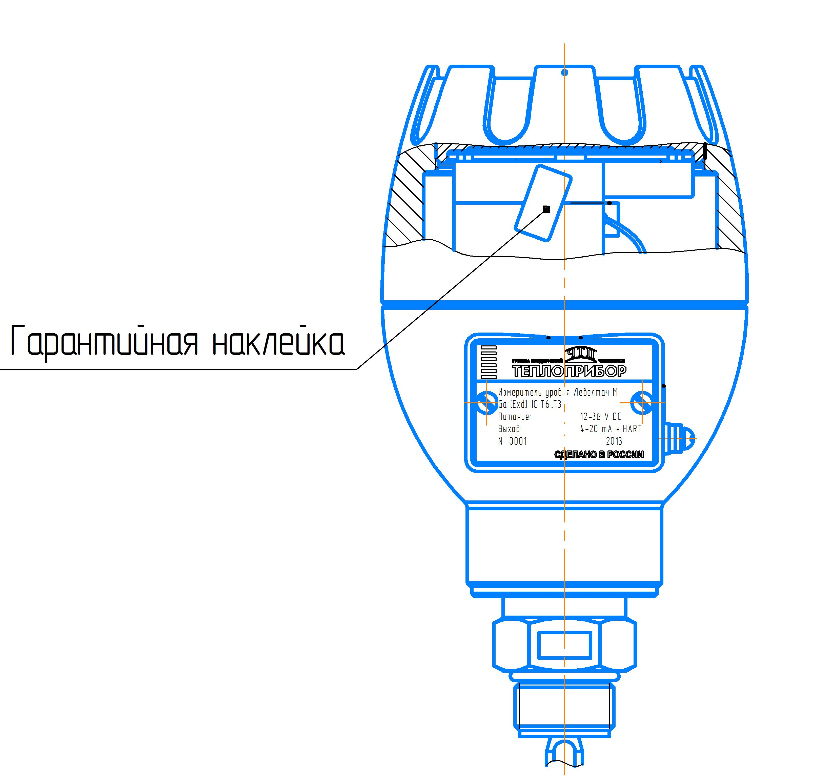 Защита от вскрытия электронного блока уровнемера обеспечивается путем наклеивания разрушающейся наклейки завода-изготовителя на место стыка крышки, закрывающей доступ к платам и корпусом, в котором они расположены. Схема пломбировки от несанкционированного доступа, обозначение мест нанесения наклейки завода-изготовителя представлены на рисунке 2.