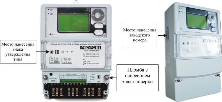 Общий вид счетчиков для навесного монтажа (модификации «Ресурс-Е4-Х-Х-н-Х») с указанием места ограничения доступа к местам настройки (регулировки), места нанесения знака утверждения типа, места нанесения заводского номера представлен на рисунке 1. Способ ограничения доступа к местам настройки (регулировки) счетчиков для навесного монтажа (модификации «Ресурс-Е4-Х-Х-н-Х») - установка навесной пломбы со знаком поверки на винт крепления корпуса счетчика.