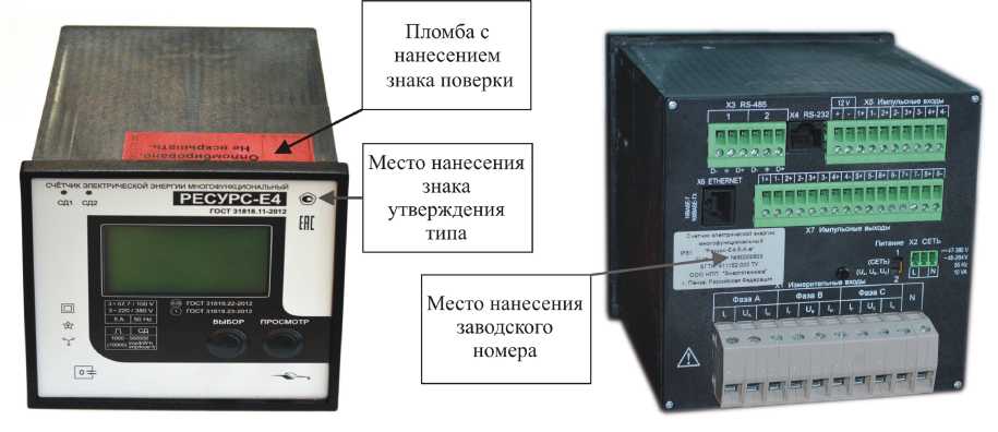 Рисунок 2 - Общий вид счетчиков для щитового монтажа (модификации «Ресурс-Е4-Х-Х-в-Х») с указанием места ограничения доступа к местам настройки (регулировки), места нанесения знака утверждения типа, места нанесения заводского номера
