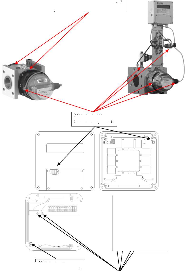 Вычислитель может быть установлен непосредственно на УРИ или монтироваться дистанционно. В случае дистанционного монтажа вычислителя (для исполнений с вычислителем ВВ1 и ВВ2) крышка вычислителя, места присоединения датчиков температуры и давления, канал счета импульсов, а также ручка клапанного блока в открытом положении, место подключения датчика перепада давления, заглушки могут пломбироваться поставщиком газа после выполнения монтажных работ.