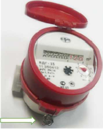 Пломбирование от несанкционированного доступа счетчиков крыльчатых холодной воды ВДХ-15М, ВДХ-15ИМ, ВДХ-20М, ВДХ-20ИМ, холодной и горячей воды ВДГ-15М, ВДГ-15ИМ, ВДГ-20М, ВДГ-20ИМ осуществляется нанесением знака поверки давлением на свинцовую (пластмассовую) пломбу. Пломба навешивается на внешнюю боковую сторону счетчика крыльчатого холодной воды ВДХ-15М, ВДХ-15ИМ, ВДХ-20М, ВДХ-20ИМ, холодной и горячей воды ВДГ-15М, ВДГ-15ИМ, ВДГ-20М, ВДГ-20ИМ посредством проволоки неразъемного хомута, проведенной через специальные отверстия, соединяющие измерительную камеру и счетный механизм. Место пломбировки счетчиков крыльчатых холодной воды ВДХ-15М, ВДХ-15ИМ, ВДХ-20М, ВДХ-20ИМ, холодной и горячей воды ВДГ-15М, ВДГ-15ИМ, ВДГ-20М, ВДГ-20ИМ представлено на рисунке 2.1^^^^И^^^^^^^^НН^^^^^Н1^^^^^^НВ