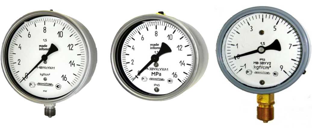 Рисунок 4 - Фотографии общего вида манометров, мановакуумметров, вакуумметров показывающих виброустойчивых М-ВУ, МВ-ВУ, В-ВУ с контрольной стрелкой