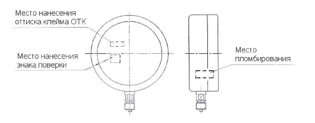 Схема пломбировки от несанкционированного доступа внутрь прибора и обозначение мест для нанесения оттисков клейма ОТК и знака поверки приведена на рисунке 5.