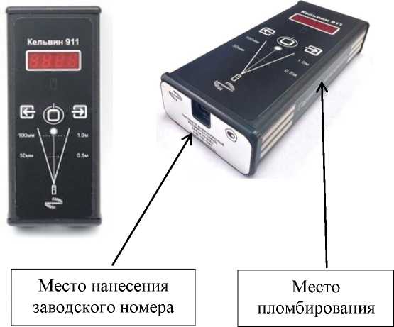 Заводской номер пирометров инфракрасных КЕЛЬВИН в виде цифрового обозначения, состоящего из арабских цифр, наносится в виде наклейки на корпус пирометра. Конструкция пирометров не предусматривает нанесение знака поверки на его корпус.