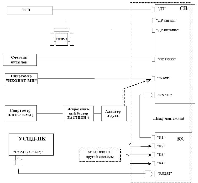 Конкретный состав системы (наличие в системе счетчиков бутылок, спиртомера, модемов, КС) определяется вариантом поставки (по заказу потребителя).