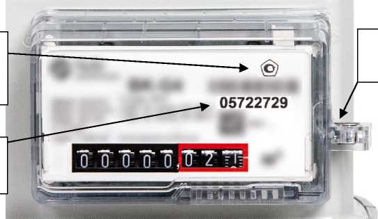 Общий вид счетчика представлен на рисунке 1. Пломбировку от несанкционированного доступа осуществляют нанесением знака поверки давлением клейма на свинцовую (пластмассовую) пломбу. Схема пломбировки от несанкционированного доступа, обозначение места нанесения знака поверки, место нанесения заводского номера и знака утверждения типа представлены на рисунке 2. Заводской номер в виде цифрового кода наносится на циферблат отсчетного механизма методом термопечати.