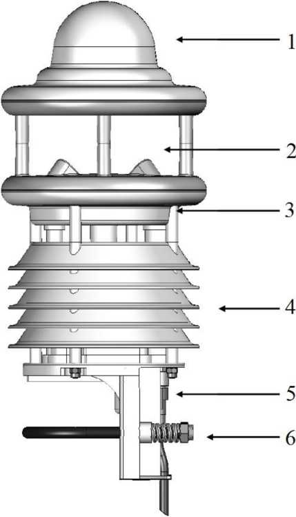 1 - преобразователь количества осадков (встроенный), 2 - преобразователь скорости и направления воздушного потока, 3 - преобразователь атмосферного давления, 4 -преобразователь температуры и относительной влажности воздуха, 5 - разъем для подключения внешних преобразователей, 6 - кронштейн для крепления станций