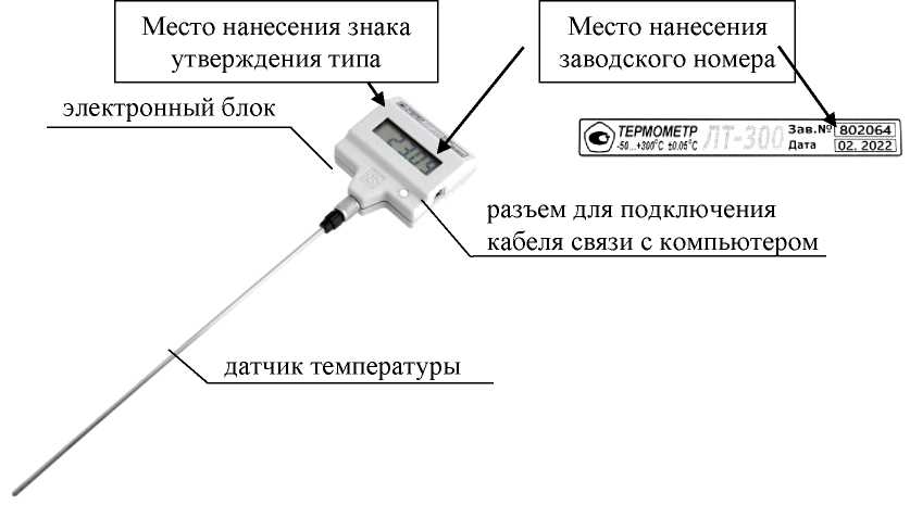 Рисунок 1 - Внешний вид термометра лабораторного электронного ЛТ-300 (модификаций -Н, -Т, -Ф) с непосредственным соединением датчика температуры к электронному блоку и с указанием мест нанесения знака утверждения типа и заводского номера