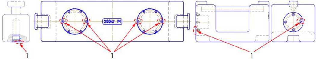 Рисунок 5 - Примеры схем пломбировки гирь (1 - место установки пломбы)