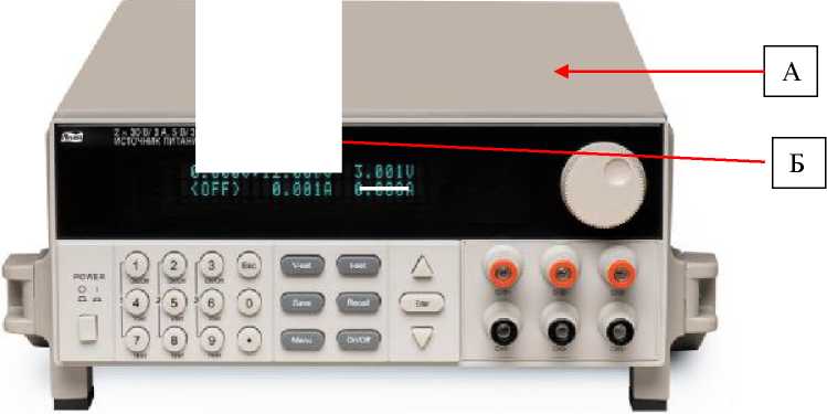 На передней панели источников расположены: кнопка включения питания; дисплей для отображения значений напряжения и тока на выходе; вращающийся регулятор для установки выходных параметров; функциональные кнопки; цифровые кнопки; кнопки со стрелками, выходные разъемы.