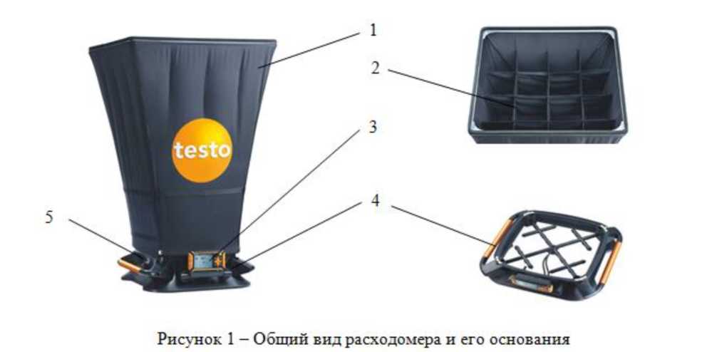 Расходомер состоит из конфузора (1) - для измерения объемного расхода воздуха со встроенным выпрямителем воздуха (2), измерительного прибора Testo 420 с датчиками (3) -для измерений абсолютного давления и разности давлений, основания (4) - с приемниками давлений и выключателя (5) - для измерений вручную.