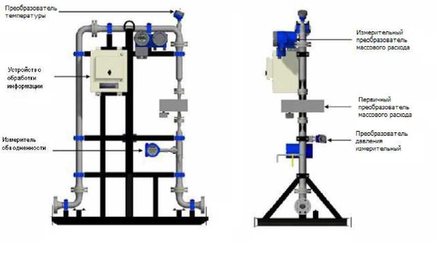 Расходомер массовый передает информацию об измеренных плотности и массовом расходе среды в устройство обработки информации NetOilComputer. Принцип действия расходомера массового основан на использовании сил Кориолиса, действующих на поток среды, двигающейся по измерительной трубке датчика, колеблющейся с частотой автоколебаний. Кориолисовые силы препятствуют колебаниям трубки датчика, что приводит к сдвигу фаз колебаний на входе и выходе измерительной трубки датчика, выполненной в виде петли. Величина сдвига фаз колебаний пропорциональна массовому расходу. Измерение плотности основано на измерении резонансной частоты колебаний трубки расходомера.