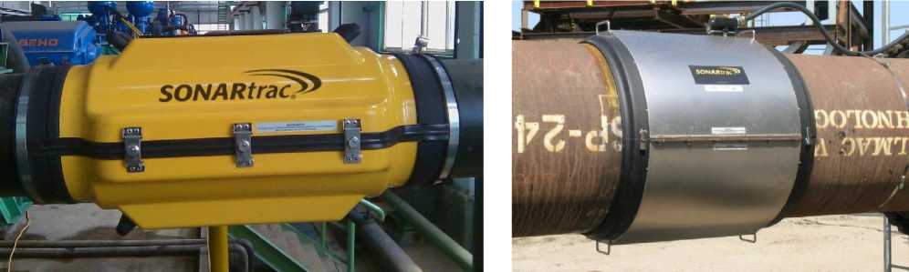 Сенсорный блок состоит из комплекта накладных акустических датчиков, установленных в защитный кожух из стекловолокна (рис.2), или нержавеющей стали (рис.3), которые с помощью стяжных хомутов крепятся накладным образом вокруг технологического трубопровода.