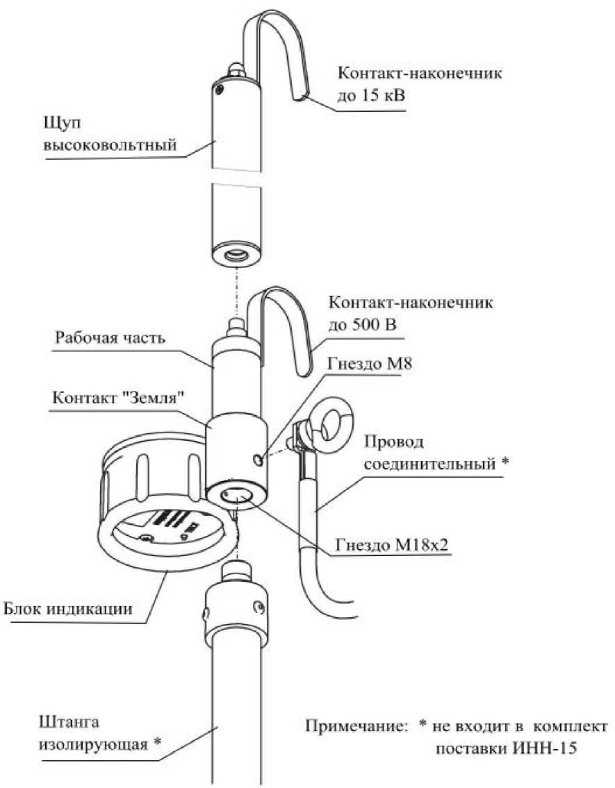 Измерители состоят из 2-х частей: рабочей части с блоком индикации и высоковольтного щупа. Измерение осуществляется с применением изолирующей штанги, соответствующей требованиям ГОСТ 20494-2001, и длина которой выбирается пользователем в зависимости от класса напряжения воздушной линии электропередачи (ВЛ), на которой планируется измер ение наведенного напряжения, и обеспечивает безопасность персонала при проведении работ на ВЛ.