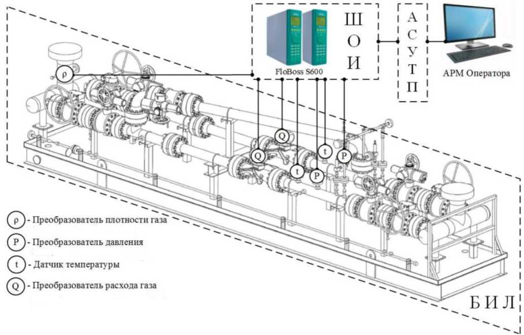 Поток газа поступает во входной коллектор БИЛ и далее, в зависимости от выбора оператора, в одну из двух измерительных линий (далее - ИЛ). БИЛ содержит две ИЛ, одна из которых является рабочей, другая - контрольно-резервной. ШОИ состоит из одного стандартного шкафа фирмы «Rittal» со смонтированными в нем двумя контроллерами измерительными FloBoss S600 (рабочий/резервный), искробезопасными барьерами, коммуникационным и другим оборудованием.