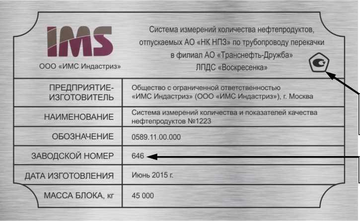 Заводской номер СИКНП нанесен графическим методом на маркировочную табличку, установленную на стене блочно-модульного здания технологического блока СИКНП.