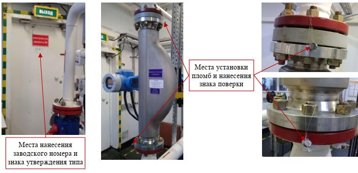 Для исключения возможности несанкционированного вмешательства, которое может повлиять на результат измерений, на фланцевых соединениях РМ предусмотрены места для установки пломб. Пломбировка осуществляется нанесением знака поверки давлением на свинцовые (пластмассовые) пломбы, установленные на контровочных проволоках, пропущенных через отверстия в шпильках, расположенных на диаметрально противоположных фланцах, согласно рисунку 2.